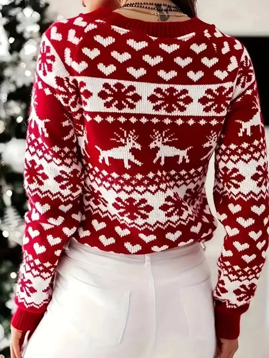 Dame Julegenser i Rød og Hvit med Reinsdyr - Festlig Strikk med Rund Hals