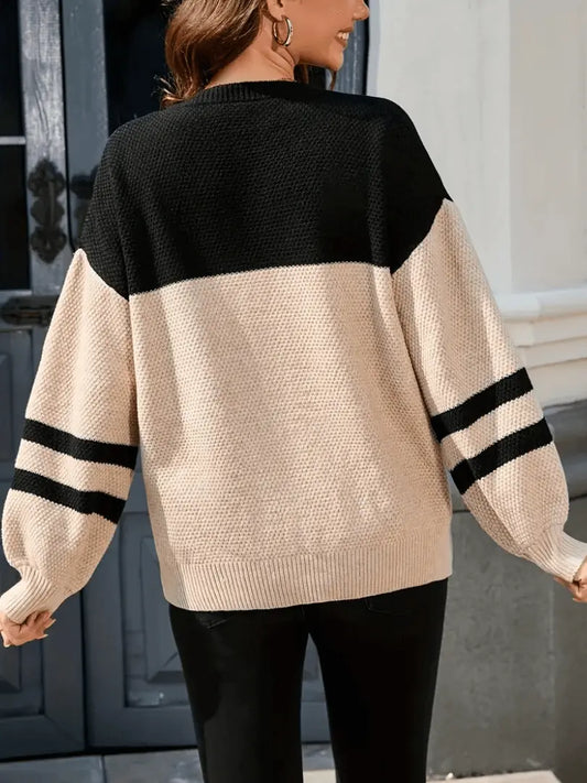 Elegant fargeblokk-strikkegenser – rund hals, puffede ermer for høst/vinter