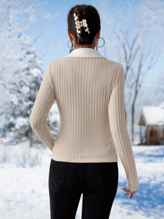 Ribbestrikket Smal T-Skjorte med Krage – Elegant Langermet Design for Vår og Høst