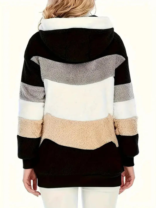 Damejakke med fargeblokker i teddystoff - Koselig hettejakke til høst og vinter