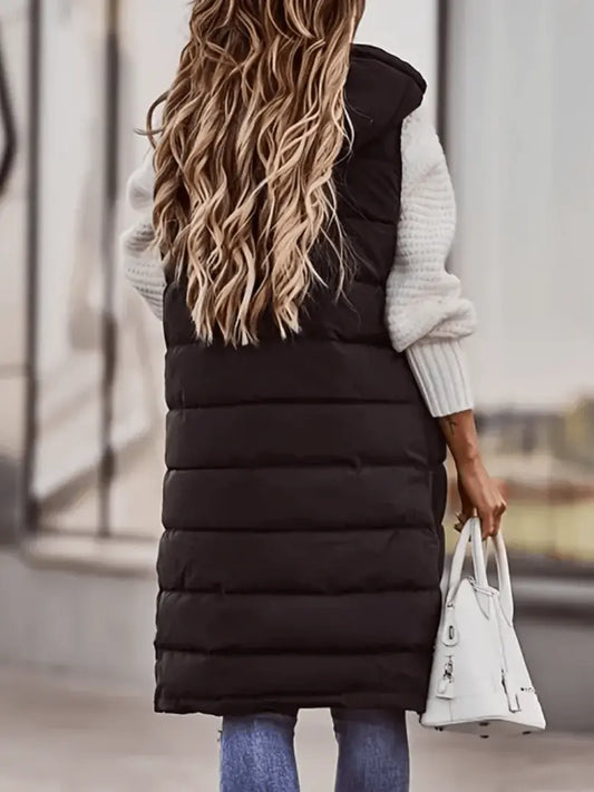 Damekåpe med Knapper og Hette - Uformell Ermeløs Lang Ytterkåpe