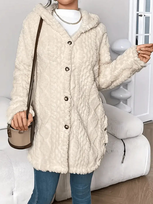 Elegant Beige Fuskepels Hettejakke - Behagelig Langermet, Knappelukking Yttertøy med Diamantmønster, Perfekt for Høst/Vinter, Maskinvaskbar