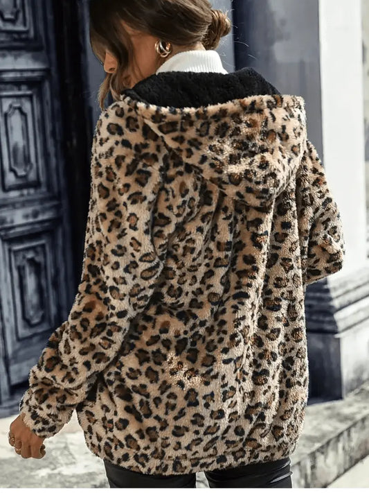 Leopardmønster med Glidelås Hette Teddyjakke - Stilig Termisk Yttertøy for Kvinner