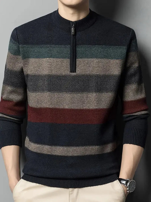 Herre Strikket Stripete Genser - Casual Half-Zip Pullover for Høst og Vinter