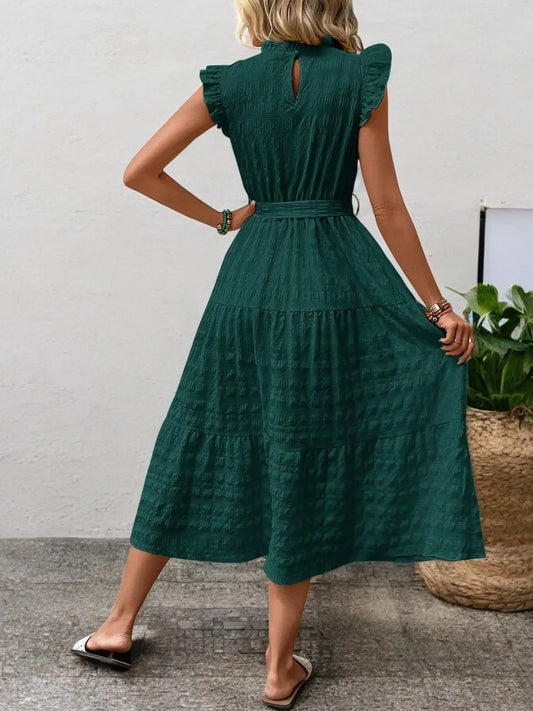 FashionFlow - Elegant Midikjole med Rufsete Ermer og Knytinger