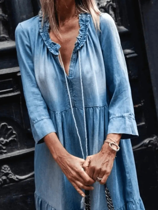 Kvinnens Ensfargede Kjole med Volangermer – Elegant Omslagsutringning