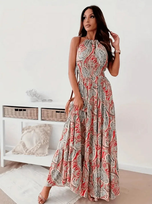BohoChic - Trendy Halterkjole med Boho-Trykk for Kvinner