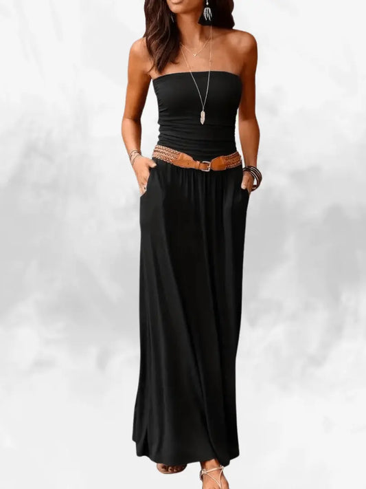 Kvinnens Stroppeløse Tubekjole – Ensfarget med Lommer og Volangkant