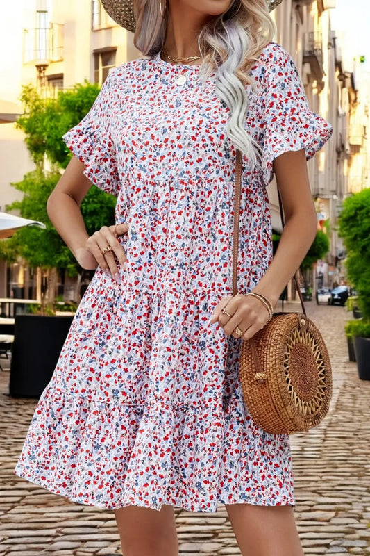 Floral Elegance Lagdelt Kjole – Flytende Volangs ermer