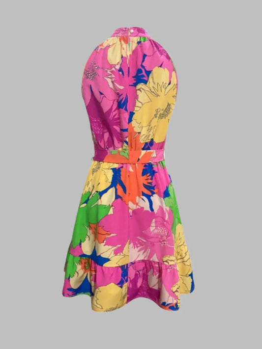 Livlig Horisont Knytebånd Kjole med Høy Hals - Dristig Tropisk Mønster